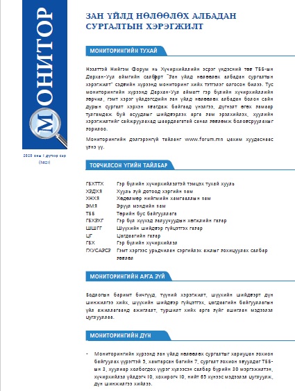 Нээлттэй Нийгэм Форум нь Хүчирхийллийн эсрэг үндэсний төв ТББ-ын Дархан-Уул аймгийн салбарт “Зан үйлд нөлөөлөх албадан сургалтын хэрэгжилт” сэдвийн хүрээнд мониторинг хийх тэтгэлэг олгосон билээ. Тус мониторингийн хүрээнд Дархан-Уул аймагт гэр бүлийн хүчирхийллийн зөрчил, гэмт хэрэг үйлдэгсдийн зан үйлд нөлөөлөх албадан болон сайн дурын сургалт хэрхэн явагдаж байгаад үнэлгээ, дүгнэлт өгөх замаар тулгамдаж буй асуудлыг шийдвэрлэх арга зам эрэлхийлэх, хуулийн хэрэгжилтийг сайжруулахад шаардлагатай санал зөвлөмж боловсруулахыг зорилоо.