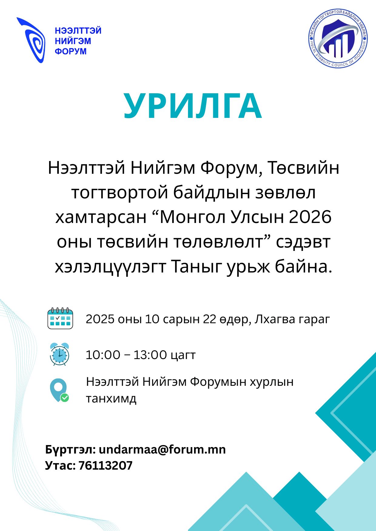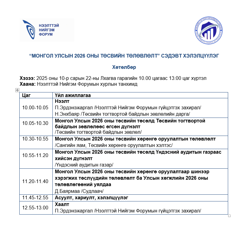 "Монгол Улсын 2026 оны төсвийн төлөвлөлт" сэдэвт хэлэлцүүлэгт Таныг урьж байна