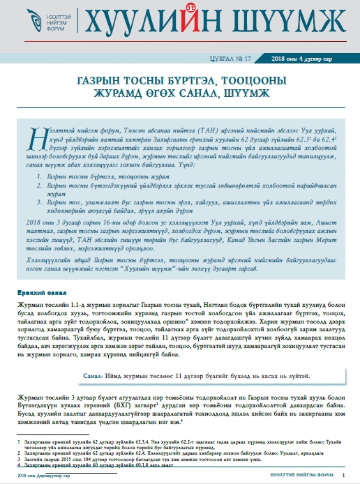 Нээлттэй нийгэм форум, Төлсөн авсанаа нийтэл (ТАН) иргэний нийгмийн эвслээс Уул уурхай, хүнд үйлдвэрийн яамтай хамтран Захиргааны ерөнхий хуулийн 62 дугаар зүйлийн 62.31 ба 62.42 дүгээр зүйлийн хэрэгжилтийг хангах зорилгоор газрын тосны үйл ажиллагаатай холбоотой шинээр боловсруулж буй дараах дүрэм, журмын төслийг иргэний нийгмийн байгууллагуудад танилцуулж, санал шүүмж авах хэлэлцүүлэг зохион байгууллаа.