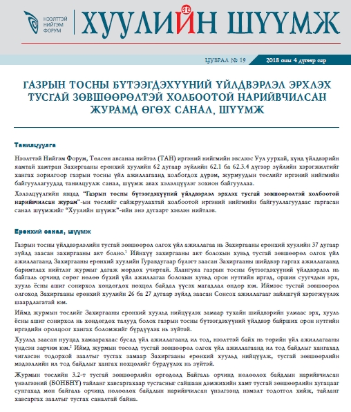 Нээлттэй Нийгэм Форум, Төлсөн авсанаа нийтэл (ТАН) иргэний нийгмийн эвслээс Уул уурхай, хүнд үйлдвэрийн яамтай хамтран Захиргааны ерөнхий хуулийн 62 дугаар зүйлийн 62.1 ба 62.3.4 дүгээр зүйлийн хэрэгжилтийг хангах зорилгоор газрын тосны үйл ажиллагаанд холбогдох дүрэм, журмуудын төслийг иргэний нийгмийн байгууллагуудад танилцуулж санал, шүүмж авах хэлэлцүүлэг зохион байгууллаа. Хэлэлцүүлгийн явцад “Газрын тосны бүтээгдэхүүний үйлдвэрлэл эрхлэх тусгай зөвшөөрөлтэй холбоотой нарийвчилсан журам”-ын төслийг сайжруулахтай холбоотой иргэний нийгмийн байгууллагуудаас гаргасан санал шүүмжийг “Хуулийн шүүмж”-ийн энэ дугаарт хэвлэн нийтлэв.