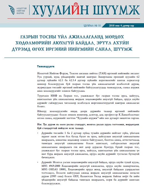 Нээлттэй Нийгэм Форум, Төлсөн авсанаа нийтэл (ТАН) иргэний нийгмийн эвслээс Уул уурхай, хүнд үйлдвэрийн яамтай хамтран Захиргааны ерөнхий хуулийн 62 дугаар зүйлийн 62.1 ба 62.3.4 дүгээр зүйлийн хэрэгжилтийг хангах зорилгоор шинээр боловсруулж буй газрын тосны үйл ажиллагаатай холбоотой дүрэм, журмуудын төслийг иргэний нийгмийн байгууллагуудад танилцуулж, санал шүүмж авах хэлэлцүүлгийг зохион байгууллаа. Түүнчлэн ННФ нь Газрын тос, уламжлалт бус газрын тосны эрэл, хайгуул, ашиглалтын үйл ажиллагаанд мөрдөх хөдөлмөрийн аюулгүй байдал, эрүүл ахуйн дүрмийг сайжруулах чиглэлээр холбогдох мэргэжилтнүүдтэй хамтран ажилласан болно.