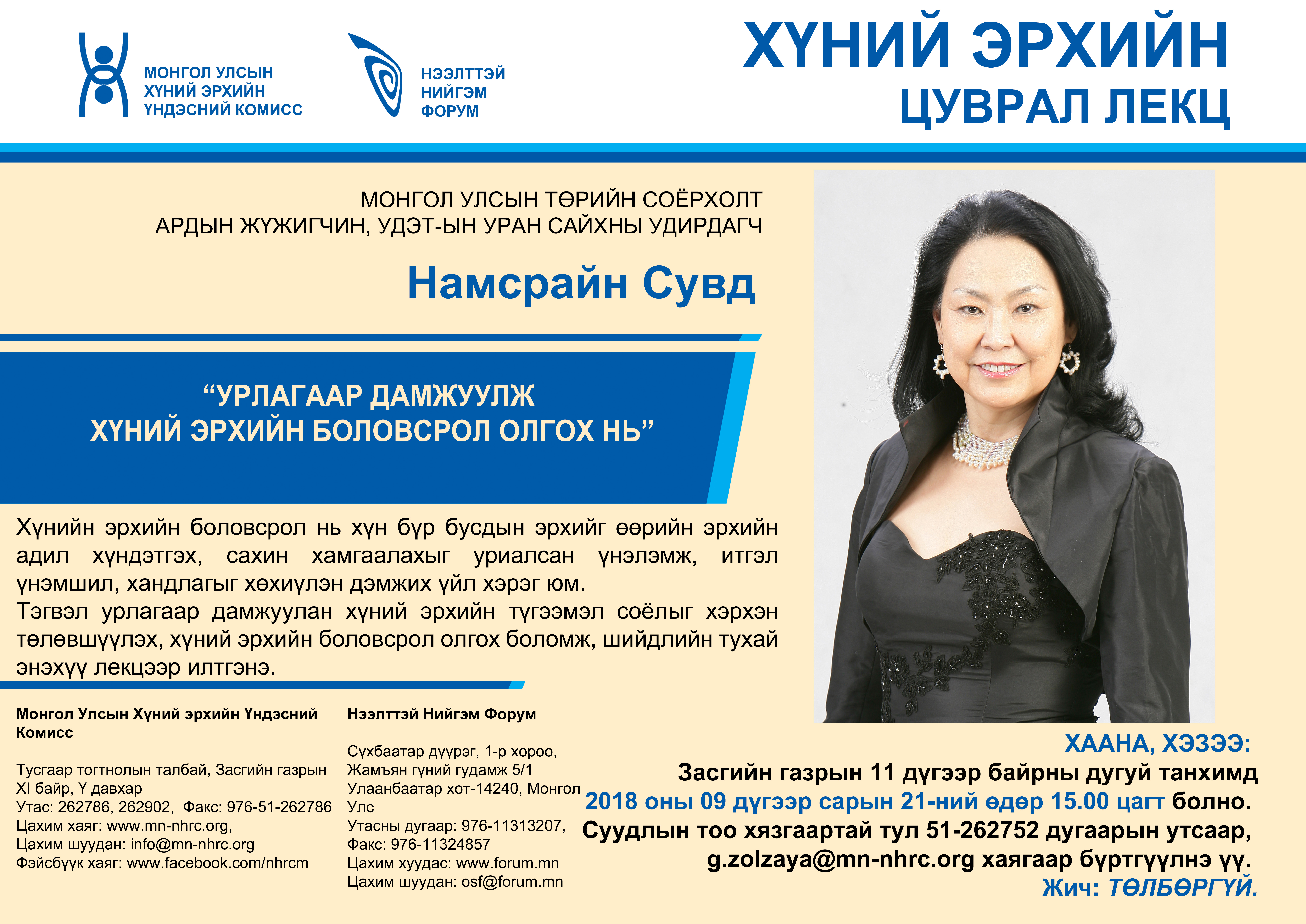 Урлагаар дамжуулж хүний эрхийн боловсрол олгох нь, МОНГОЛ УЛСЫН ТӨРИЙН СОЁРХОЛТ АРДЫН ЖҮЖИГЧИН УДЭТ-ЫН УРАН САЙХНЫ УДИРДАГЧ Намсрайн Сувд.