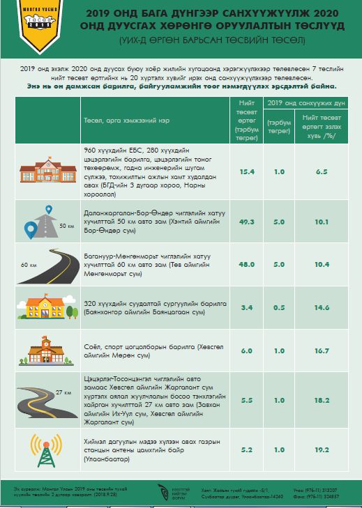 2019 ОНД БАГА ДҮНГЭЭР САНХҮҮЖҮҮЛЖ 2020 ОНД ДУУСГАХ ХӨРӨНГӨ ОРУУЛАЛТЫН ТӨСЛҮҮД (УИХ-Д ӨРГӨН БАРЬСАН ТӨСВИЙН ТӨСӨЛ)