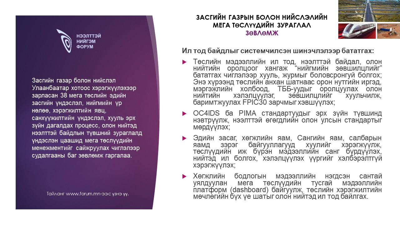 Засгийн газрын болон нийслэлийн мега төслүүдийн зураглал зөвлөмж: Ил тод байдлыг системчилсэн шинэчлэлээр бататгах